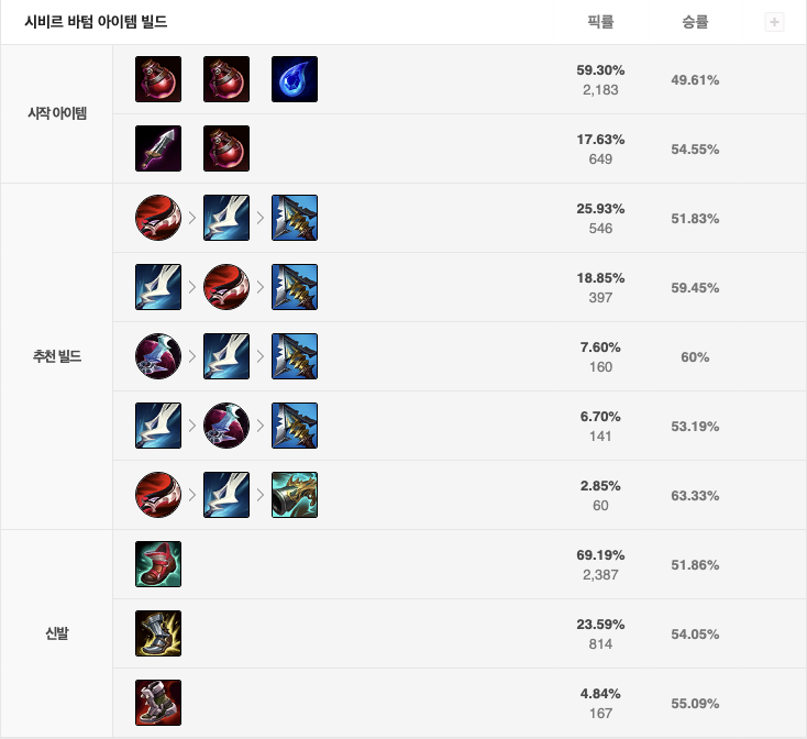시비르는 현재 승률 52.09%로 4티어 챔피언입니다.