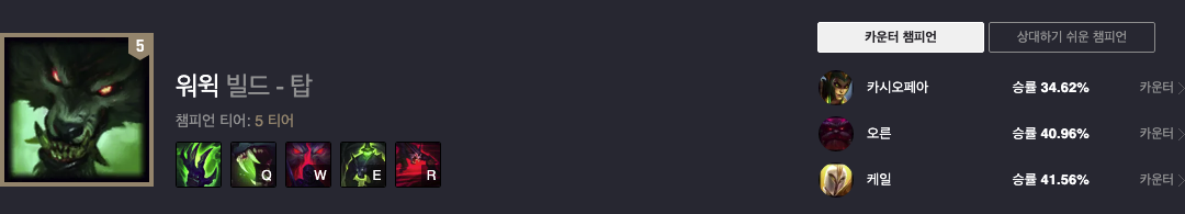 워윅는 현재 승률 50.74%로 4티어 챔피언입니다. 카운터 챔으로 케일 / 오른 / 신지드가 있으므로, 밴해주시면 되겠습니다.