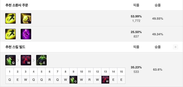 소환사주문은 점멸 / 방어막를 들어주시고, 스킬 빌드는 Q - W - E 순서로 마스터 해주면 됩니다.