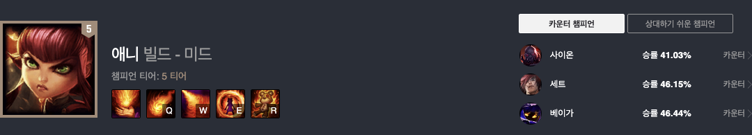 애니는 현재 승률 50.57%로 5티어 챔피언입니다.