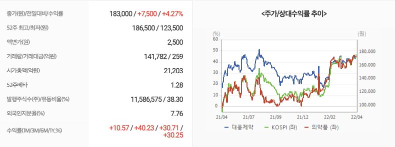 2022년 04월 29일 기준으로 대웅제약의 주당 가격은 183,000원 입니다.