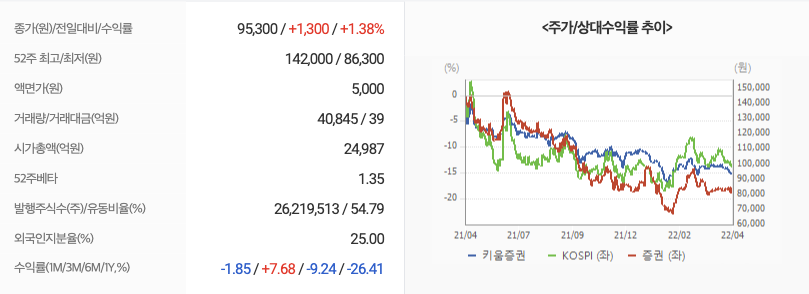 2022년 04월 29일 기준으로 키움증권의 주당 가격은 95,300원 입니다.