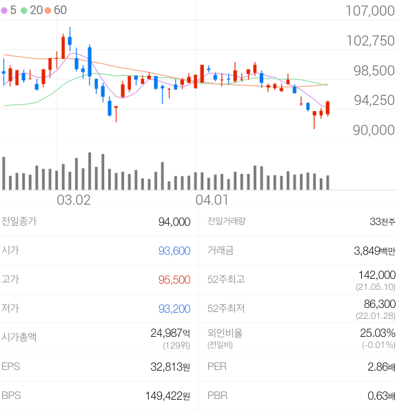 전일종가 : 95,300 원 | 키움증권 과거 평균 지표 기준 | 동종업계 평균 지표 기준 |