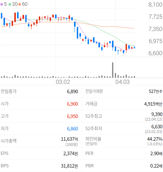 2023년 04월 11일 기준으로 DGB금융지주의 주당 가격은 6,890원 입니다.