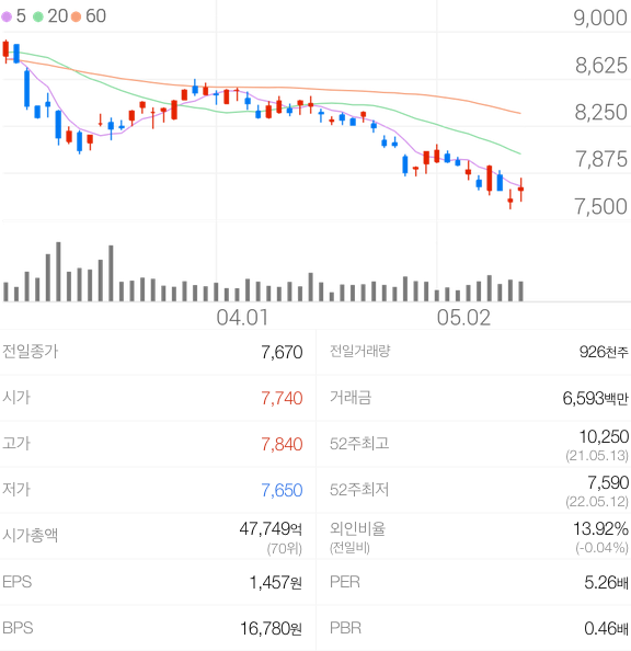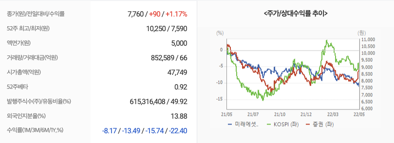 2022년 05월 13일 기준으로 미래에셋증권의 주당 가격은 7,760원 입니다.