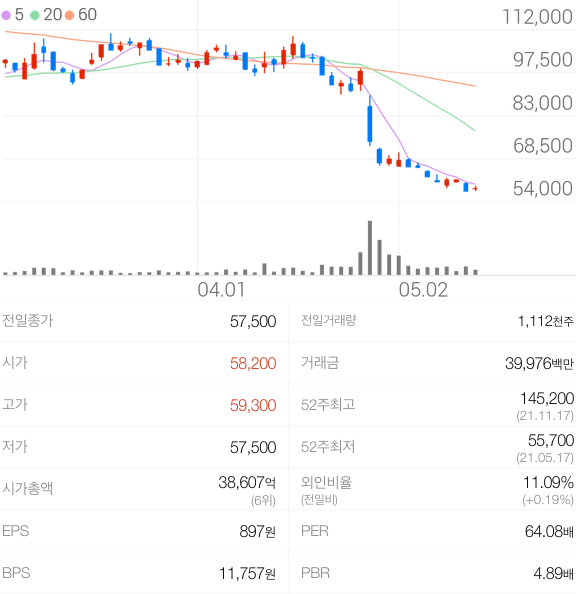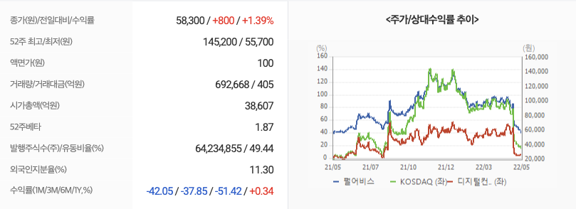 2022년 05월 13일 기준으로 펄어비스의 주당 가격은 58,300원 입니다.