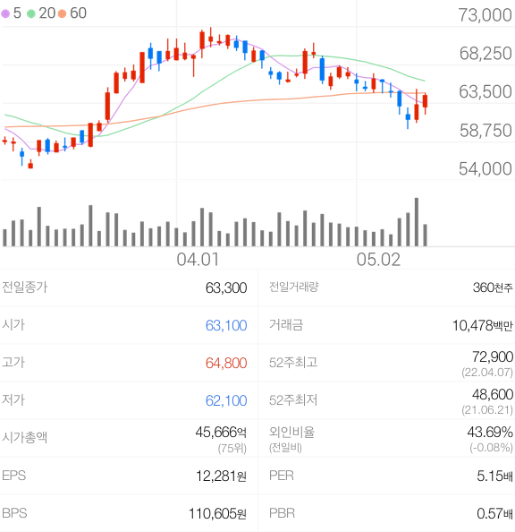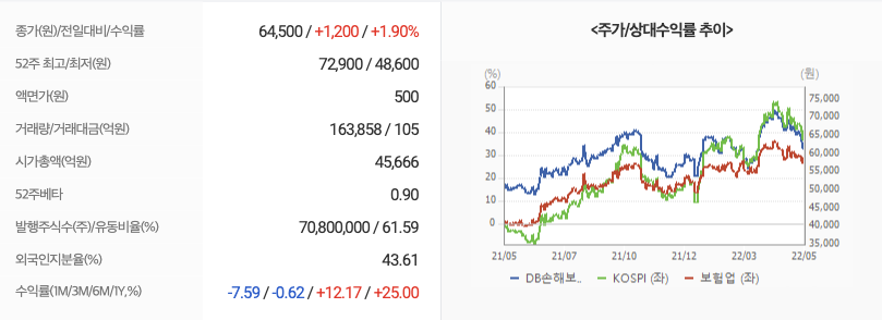 2022년 05월 13일 기준으로 DB손해보험의 주당 가격은 64,500원 입니다.