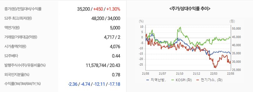2022년 05월 13일 기준으로 지역난방공사의 주당 가격은 35,200원 입니다.