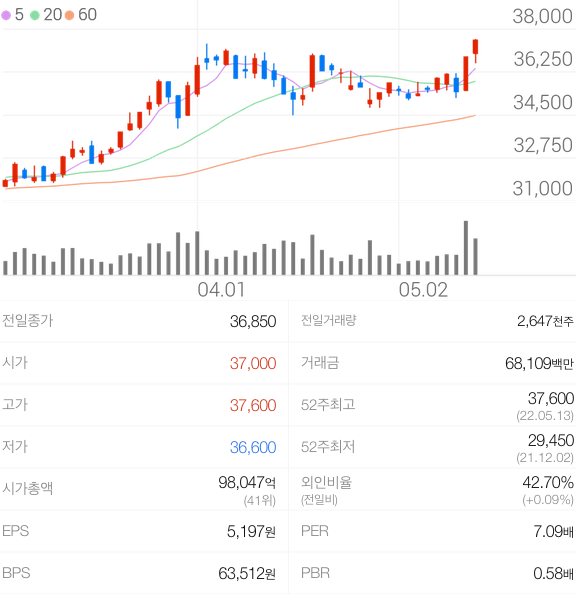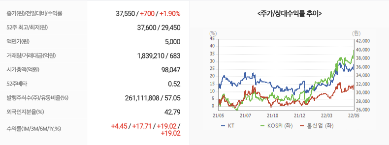 2022년 05월 13일 기준으로 KT의 주당 가격은 37,550원 입니다.