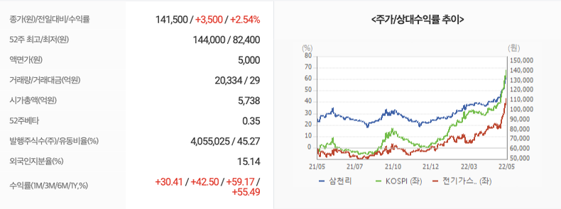 2022년 05월 18일 기준으로 삼천리의 주당 가격은 141,500원 입니다.
