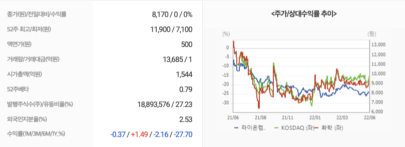 2022년 06월 08일 기준으로 라이온켐텍의 주당 가격은 8,170원 입니다.