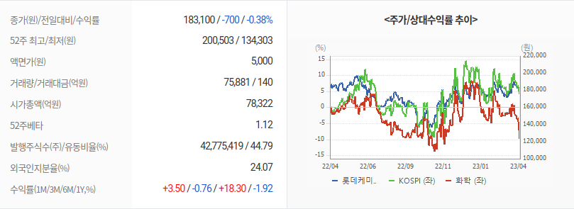 2023년 04월 12일 기준으로 롯데케미칼의 주당 가격은 183,100원 입니다.