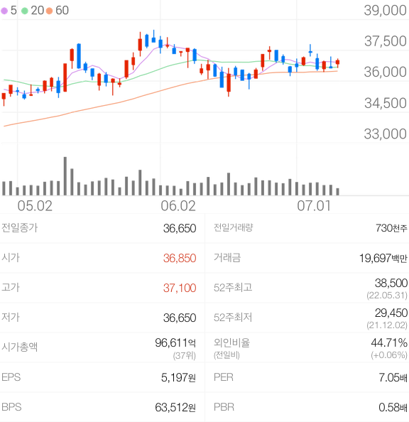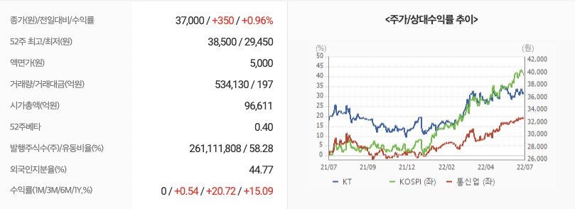 2022년 07월 11일 기준으로 KT의 주당 가격은 37,000원 입니다.