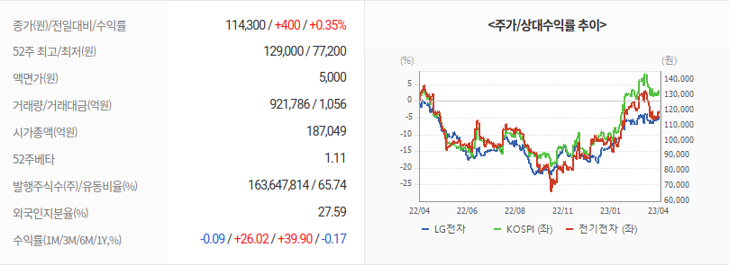 2023년 04월 10일 기준으로 LG전자의 주당 가격은 113,000원 입니다.