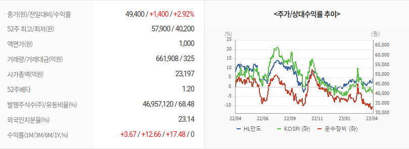 2023년 04월 12일 기준으로 HL만도의 주당 가격은 49,400원 입니다.