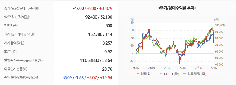 2022년 07월 12일 기준으로 덴티움의 주당 가격은 74,600원 입니다.