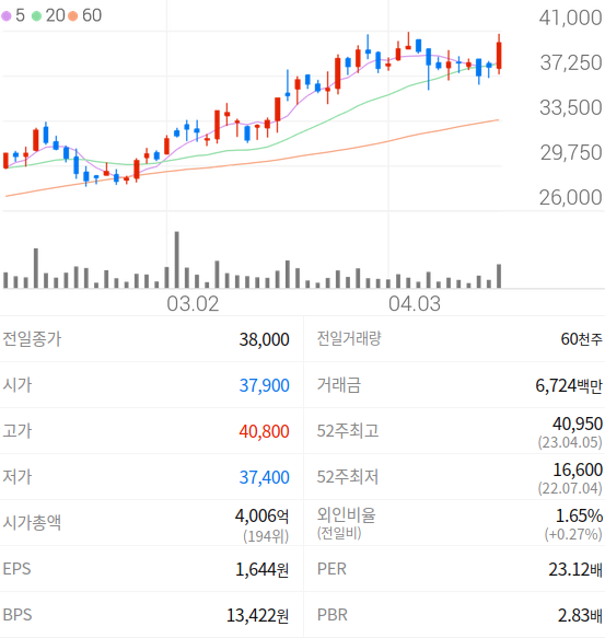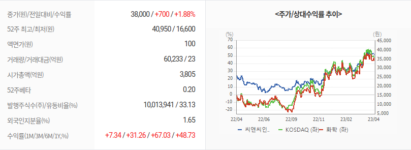 2023년 04월 17일 기준으로 씨앤씨인터내셔널의 주당 가격은 38,000원 입니다.