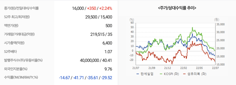 2022년 07월 18일 기준으로 한세실업의 주당 가격은 16,000원 입니다.