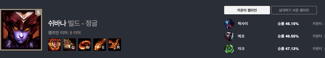 쉬바나는 현재 승률 51.17%로 5티어 챔피언입니다.