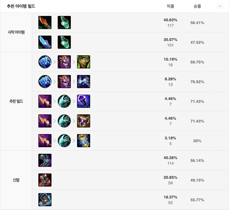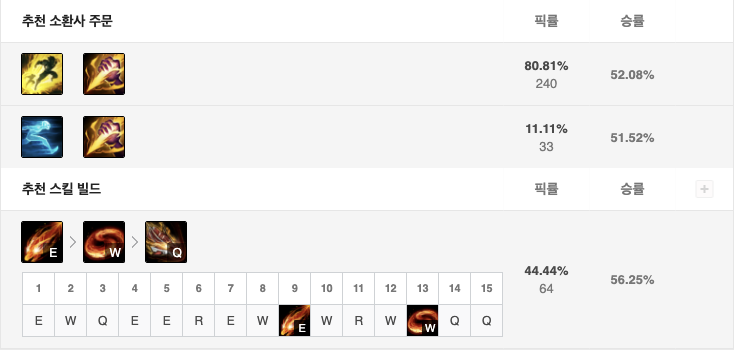 스킬 빌드는 E - W - Q 순서로 마스터 해주면 됩니다.