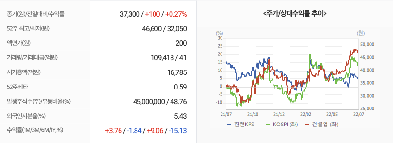 2022년 07월 20일 기준으로 한전KPS의 주당 가격은 37,300원 입니다.