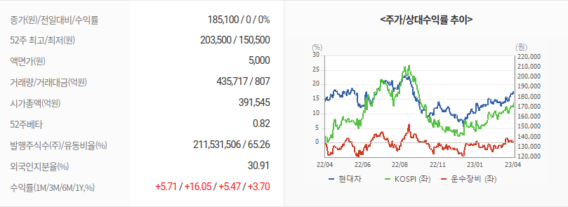 2023년 04월 10일 기준으로 현대차의 주당 가격은 185,900원 입니다.