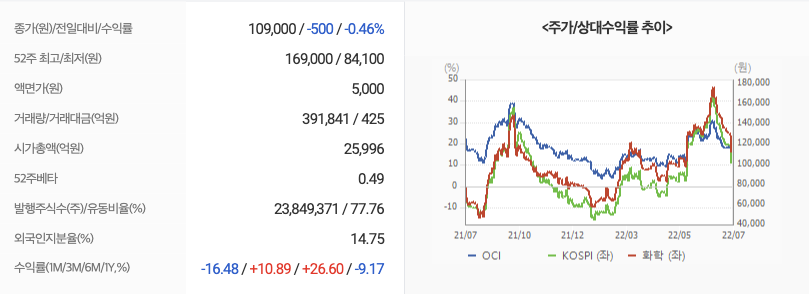 2022년 07월 27일 기준으로 OCI의 주당 가격은 109,000원 입니다.