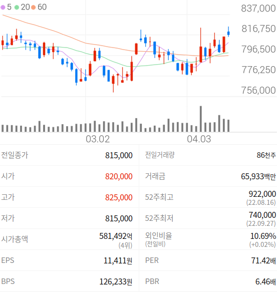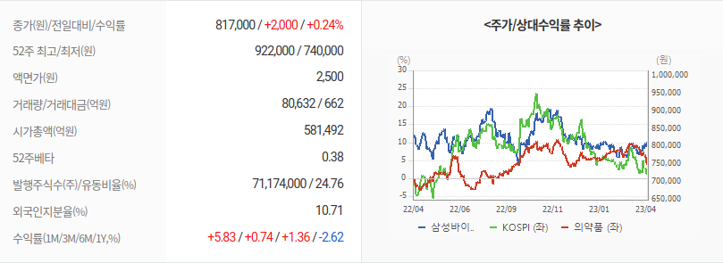 2023년 04월 14일 기준으로 삼성바이오로직스의 주당 가격은 817,000원 입니다.