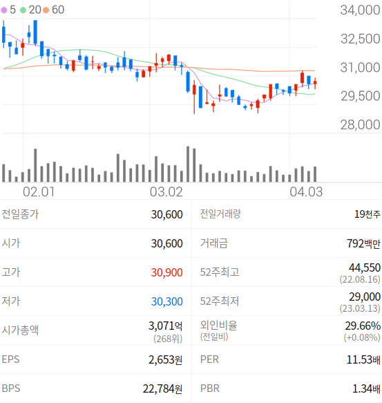 2023년 04월 07일 기준으로 뷰웍스의 주당 가격은 30,700원 입니다.