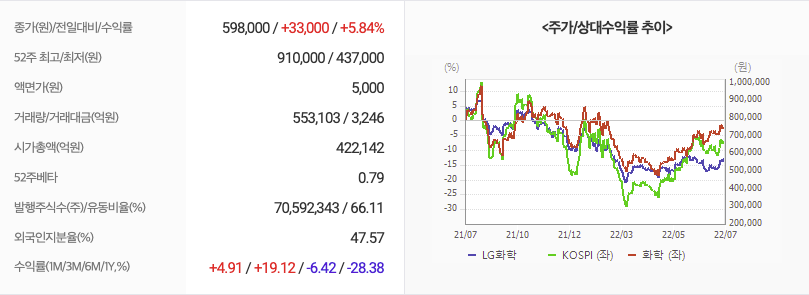 2022년 07월 28일 기준으로 LG화학의 주당 가격은 598,000원 입니다.