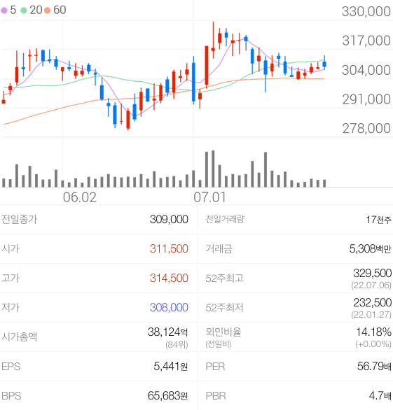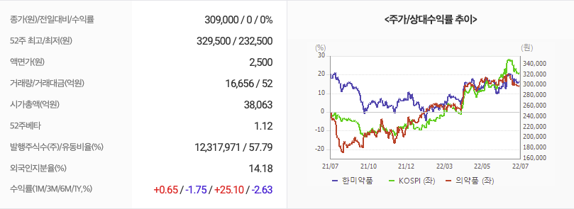 2022년 07월 28일 기준으로 한미약품의 주당 가격은 309,000원 입니다.