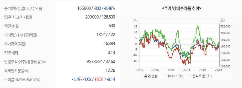 2023년 04월 05일 기준으로 롯데칠성의 주당 가격은 165,800원 입니다.