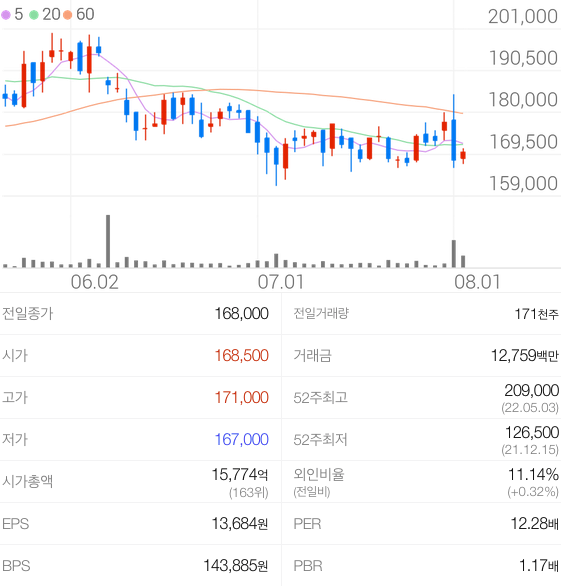 2022년 08월 02일 기준으로 롯데칠성의 주당 가격은 170,000원 입니다.