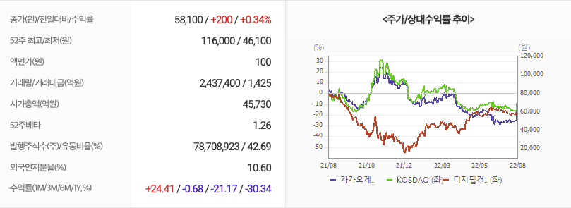 2022년 08월 04일 기준으로 카카오게임즈의 주당 가격은 58,100원 입니다.