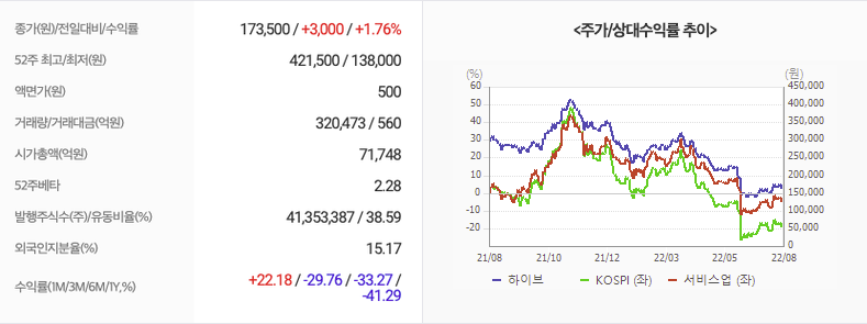 2022년 08월 04일 기준으로 하이브의 주당 가격은 173,500원 입니다.