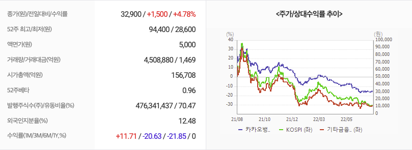 2022년 08월 04일 기준으로 카카오뱅크의 주당 가격은 32,900원 입니다.