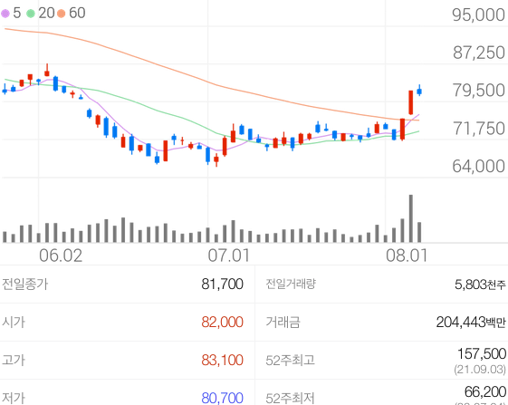 2022년 08월 05일 기준으로 카카오의 주당 가격은 81,200원 입니다.