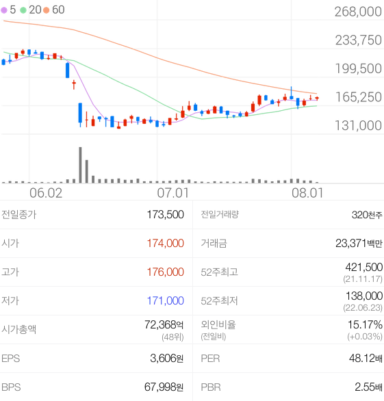 2022년 08월 05일 기준으로 하이브의 주당 가격은 175,000원 입니다.