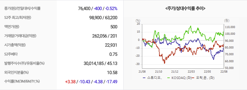 2022년 08월 05일 기준으로 스튜디오드래곤의 주당 가격은 76,400원 입니다.