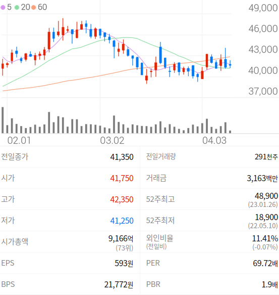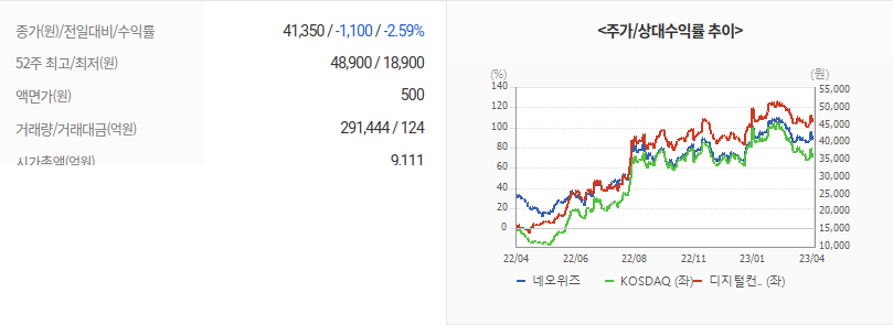 2023년 04월 10일 기준으로 네오위즈의 주당 가격은 41,350원 입니다.