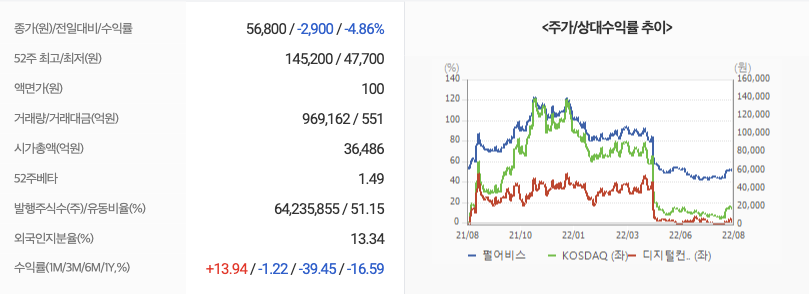 2022년 08월 12일 기준으로 펄어비스의 주당 가격은 56,800원 입니다.