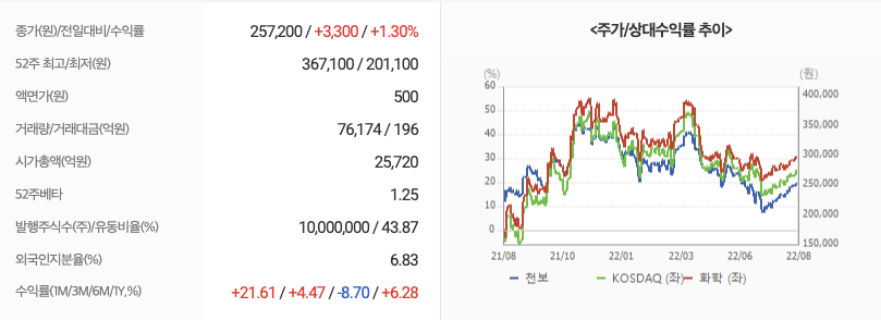 2022년 08월 12일 기준으로 천보의 주당 가격은 257,200원 입니다.