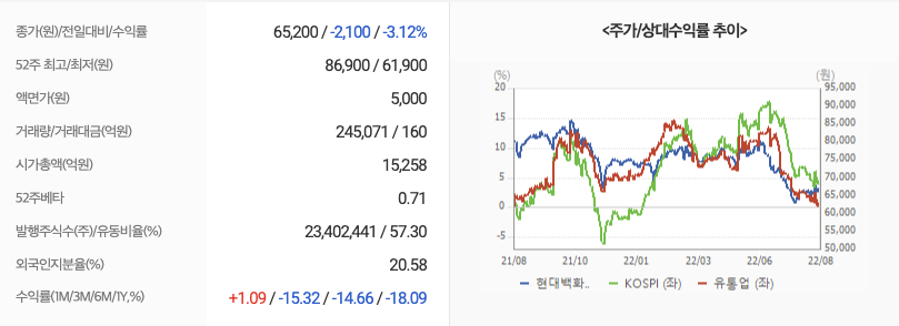 2022년 08월 12일 기준으로 현대백화점의 주당 가격은 65,200원 입니다.