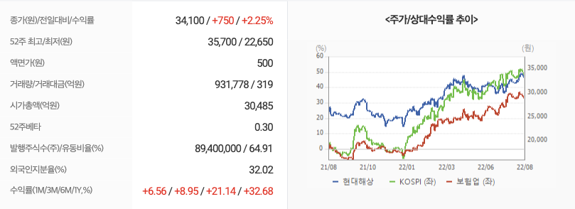 2022년 08월 12일 기준으로 현대해상의 주당 가격은 34,100원 입니다.