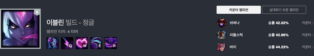 이블린는 현재 승률 51.35%로 3티어 챔피언입니다.