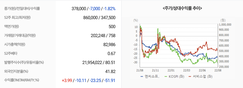 2022년 08월 16일 기준으로 엔씨소프트의 주당 가격은 378,000원 입니다.