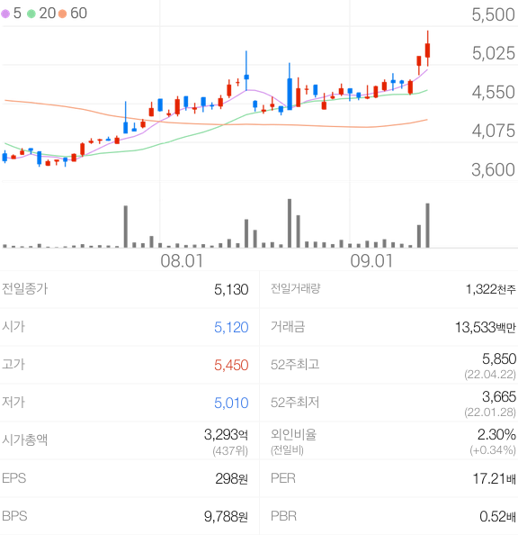 2022년 09월 15일 기준으로 무림P&P의 주당 가격은 5,130원 입니다.