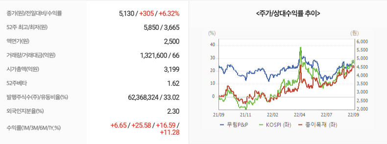 2022년 09월 15일 기준으로 무림P&P의 주당 가격은 5,130원 입니다.