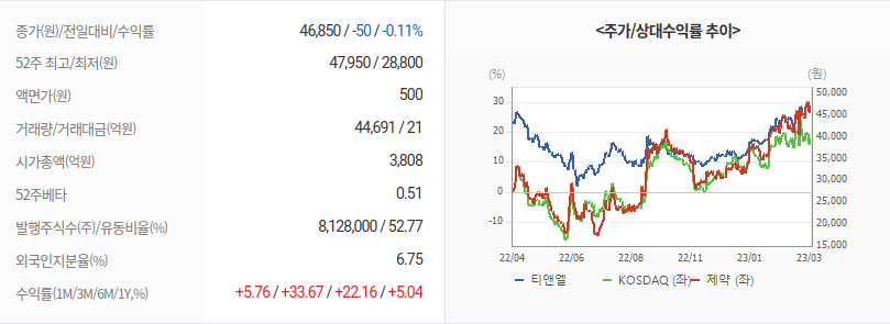 2023년 04월 05일 기준으로 티앤엘의 주당 가격은 49,150원 입니다.