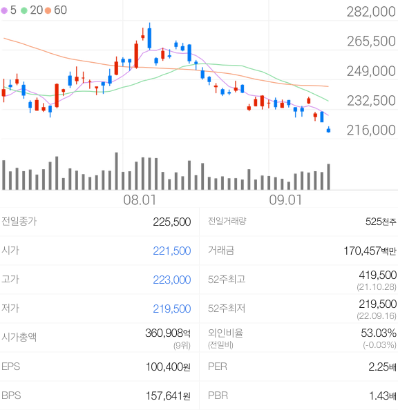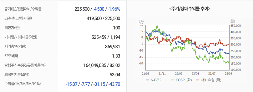 2022년 09월 15일 기준으로 NAVER의 주당 가격은 225,500원 입니다.